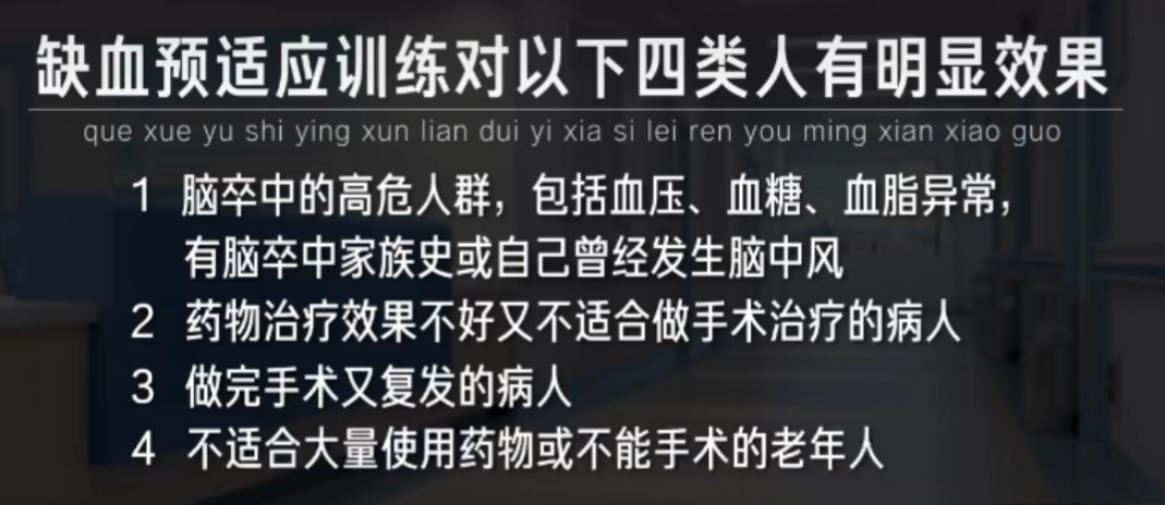 他表示,缺血預適應的訓練,主要是用于心腦卒中的預防和治療,經臨床結果表明,對這四類人群有顯著的效果。